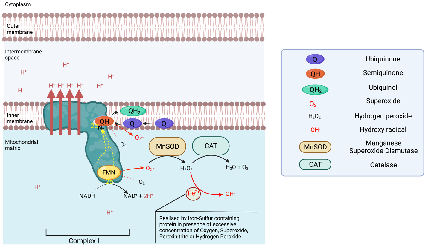 Complex I is an NADH : ubiquinone oxidoreductase, and is one of the largest membrane-bound enzymes in the cell. Complex I contains 44 subunits in mammals2, including 14 core subunits enabling its catalytic activities and conserved from bacteria to humans3,4. Complex I catalyse NADH oxidation to NAD+ on the matrix side, capturing 2 electrons that are going to be transferred toward the membrane domain along a Flavin Mononucleotide (FMN) located near the site of NADH oxidation and a chain of iron-sulfur clusters up to the N2 cluster from which the electrons are going to be donated to the Ubiquinone-10 (Q10 or Q) in the Q chamber, thus reducing the lipophilic Ubiquinone to Ubiquinol (QH2). QH2 will transport the electron across the inner membrane and donate them to complex III. The reduction of Ubiquinone to ubiquinol provides the energy necessary to transport four protons (Hydrogen ions) across the complex I membrane domain5. It is of note that NAD+ is reactivated to NADH via Beta oxidation of fatty acids and the tricarboxylic acid cycle taking place in the mitochondrial matrix. Complex I is able to leak electrons at two sites 6 and transfer them to Oxygen forming superoxide ions (O.–) during the transfer of electrons from the NADH oxidase to the N2 cluster. The superoxide produced is found in the matrix, which can be converted in the matrix to hydrogen peroxide via a manganese superoxide dismutase (MnSOD). Complex I is the main source of ROS (reactive oxygen species) in the respiratory chain. If the production of superoxide is not balanced out by the activity of MnSOD, superoxide can deactivate complex I7. Superoxide is also the primary source of the very destructive Hydroxyl radical.