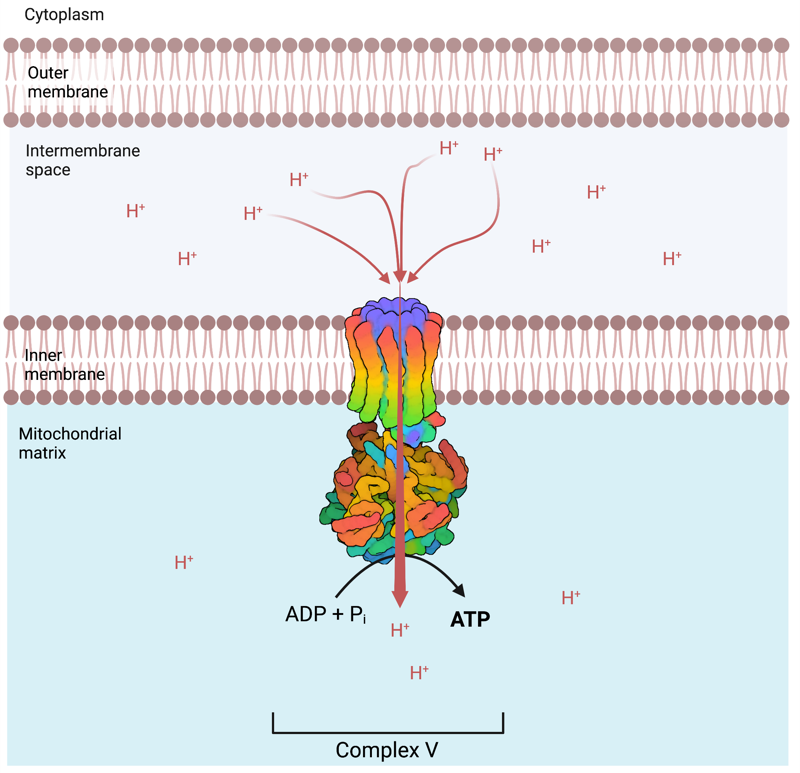 The ATP synthase sometimes called Complex V, is a mitochondrial enzyme localized in the inner membrane adjacent to the respiratory complexes. It catalyzes the synthesis of ATP from ADP and phosphate, using the energy derived from the re-entry flux of protons (H+) in the matrix from the intermembrane space. Thus, the respiratory chain enabled accumulation of H+ (Hydrogen ions) in the intermembrane space is the power that enables ATP synthesis in the mitochondria. The energy needed to pump H+ from the mitochondrial matrix to the intermembrane space is naturally derived from the metabolism of nutrients that we consume, such as the tricarboxylic acid cycle (also called the Kreb cycle), and the Beta oxidation of fatty acids or glutaminolysis. It is therefore directly associated with both the food and toxins ingested on a daily basis, that will determine the availability of the required cellular and mitochondrial ingredients, that enables an increase or decrease of ATP production.